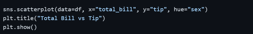 The hue parameter automatically assigns different colors to categories — in this case, distinguishing between male and female customers, without any extra code.