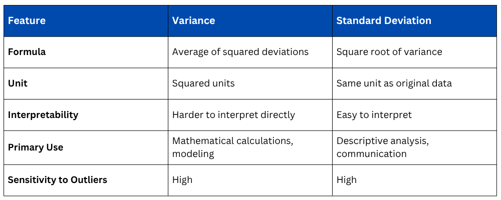 The limitation of variance — Because differences are squared, the result is in squared units (e.g., squared dollars, squared points), making it difficult to interpret directly in the context of the original data. This is exactly why standard deviation is used alongside it.