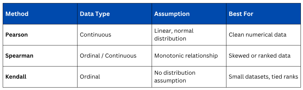 1. Pearson Correlation assumes that both variables are continuous and approximately normally distributed, and that their relationship is linear. It is the standard choice for clean, well-distributed numerical data.