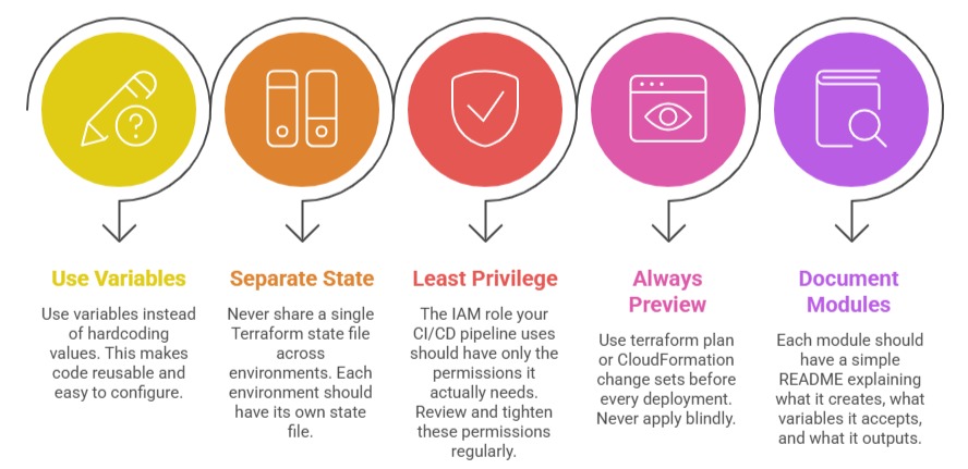 Version Control Your IaC Code: All IaC files must live in a Git repository — not on someone's laptop, not on a shared drive. Every change goes through a pull request, gets reviewed, and is merged with a clear commit message. This gives you a full history of every infrastructure change ever made.