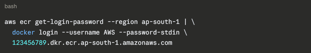 Before pushing or pulling images, your environment must authenticate with ECR. AWS handles this through the AWS CLI — it generates a temporary authentication token valid for 12 hours.