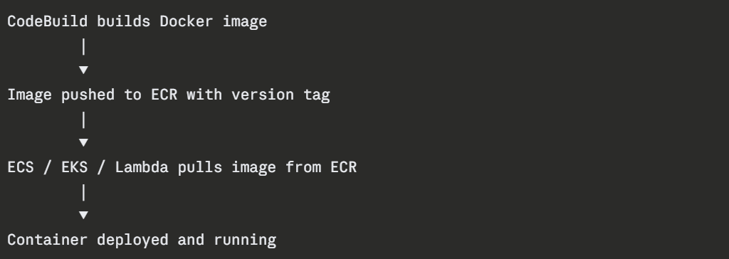 ECR sits between your build stage and your deployment stage. The CI/CD pipeline builds the image, pushes it to ECR, and then the deployment service pulls it from ECR to run.