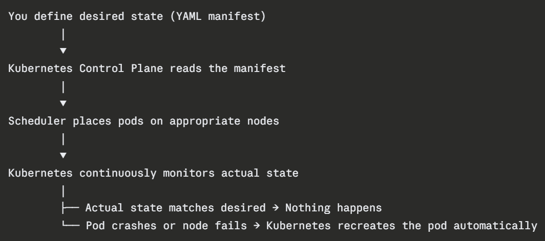 This is the core principle of Kubernetes — declarative management. You declare what you want. Kubernetes makes it happen and keeps it that way.