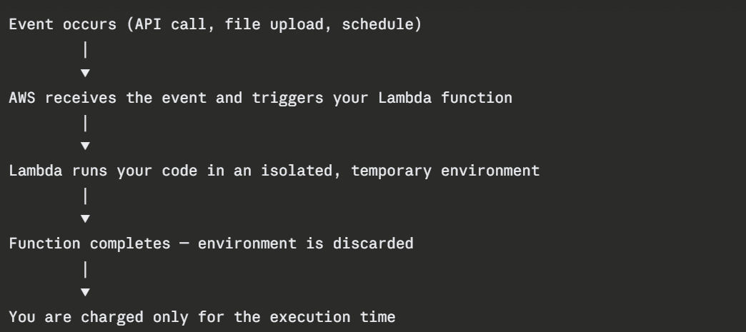 AWS provisions the infrastructure, runs your code, scales it automatically, and shuts it down when it is not needed. You only deal with the code itself.