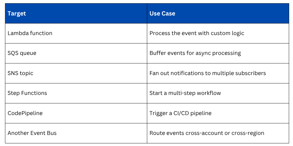 2. Target: Where to send the matching event. A Lambda function, an SQS queue, an SNS topic, another event bus, a Step Functions workflow, and more.