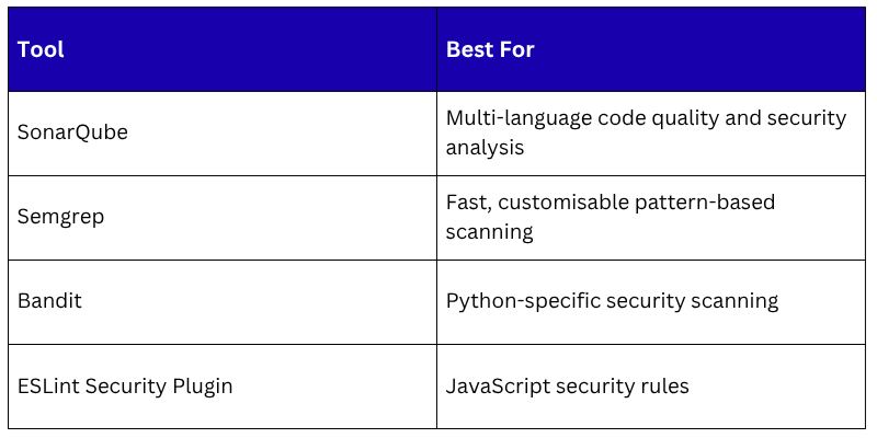 SAST analyses your source code without executing it. It looks for known vulnerability patterns — insecure functions, SQL injection risks, hardcoded credentials, improper input validation, weak cryptography.