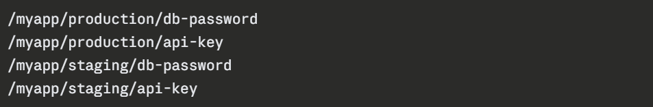 Parameter Store supports a hierarchical naming structure using forward slashes. This makes parameters easy to organise and apply IAM policies to entire branches of the hierarchy: