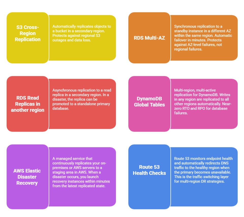 The simplest and cheapest strategy. Regular backups of data and configuration are stored in S3 or AWS Backup. When a disaster occurs, you restore from the most recent backup and rebuild the infrastructure from IaC.