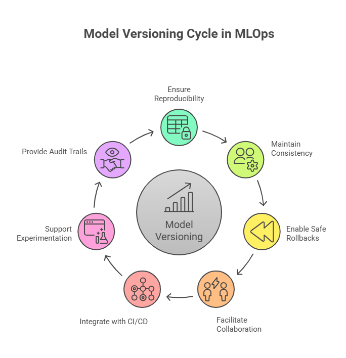 Model versioning is essential for seamless collaboration among data scientists, ML engineers, DevOps teams, and data engineers in Advanced MLOps and DataOps setups. Multiple teams can work on experiments, feature engineering, and deployments simultaneously without overwriting or conflicting with each other’s work. Centralized versioning ensures organized workflows, consistent codebases, and harmonized data pipelines, fostering transparency, communication, and shared ownership of AI solutions.