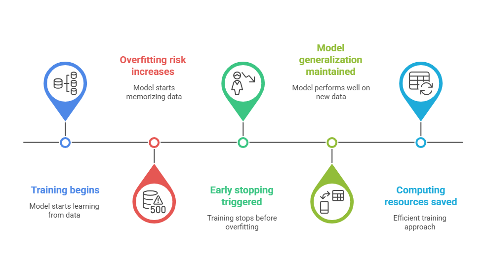 Early stopping monitors the model’s performance on a validation set during training, halting training once the validation error stops improving, thus preventing the model from overfitting by training for too long.