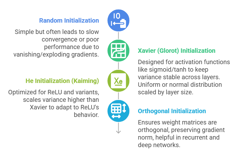 Proper initialization avoids gradient problems, especially in deep networks with many layers.