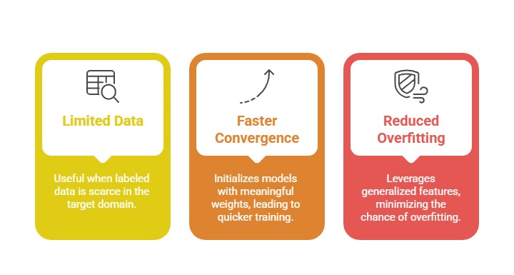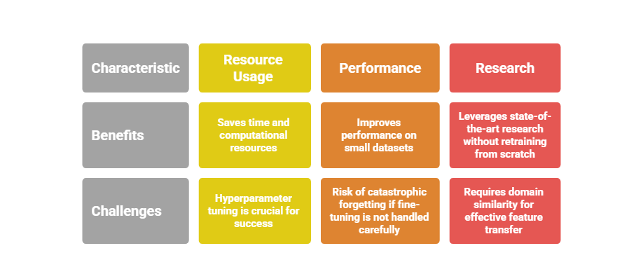 Outlined below are the major benefits and corresponding challenges associated with transfer learning techniques. They provide insight into performance gains as well as operational constraints to consider.