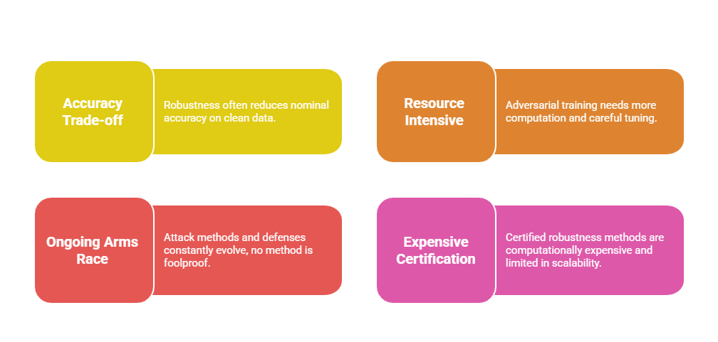 Below are important trade-offs to consider when enhancing model robustness. Achieving security against adversarial threats often comes with cost, complexity, and potential accuracy reduction.