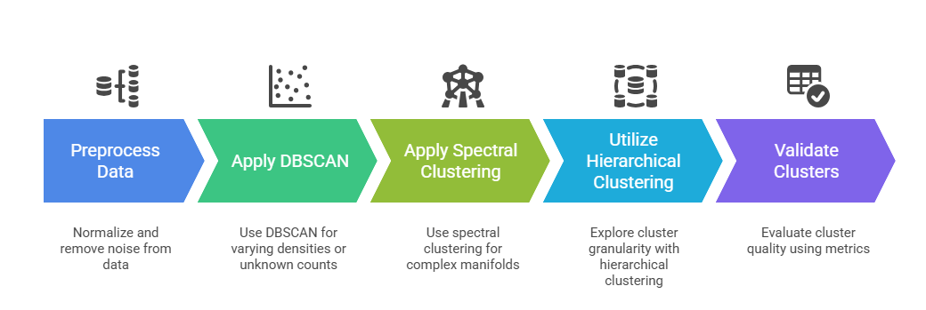 Advantages: Highly effective for identifying non-convex and complex cluster structures. They are particularly well-suited for handling connected components and data that lie on manifolds, capturing patterns that other clustering approaches may miss.
