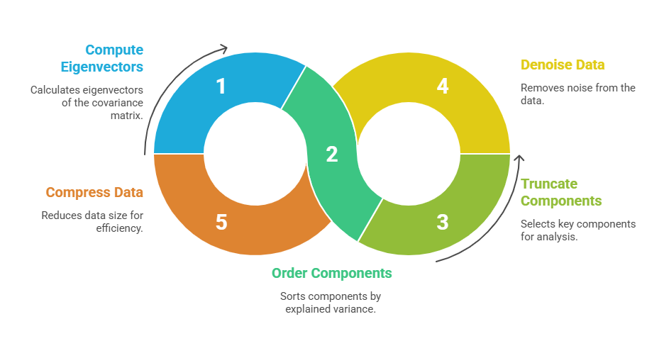 This transformation facilitates data visualization, noise reduction, and computational efficiency.