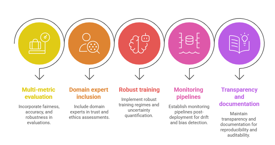 3. Fairness and Robustness Metrics: Incorporate bias detection and adversarial robustness checks.