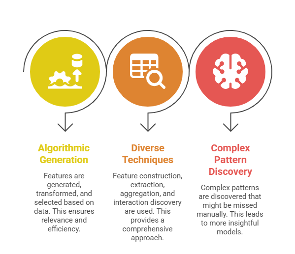 4. Feature Synthesis: Tools like FeatureTools apply relational and temporal data aggregation to synthesize features from multi-table datasets.