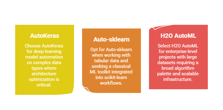 Among the most prominent AutoML frameworks are AutoKeras, Auto-sklearn, and H2O AutoML, each offering unique capabilities, strengths, and user experiences to simplify and accelerate the end-to-end machine learning pipeline.