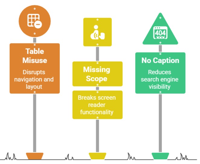 Reserve tables for true tabular data where rows and columns have meaning. Add a <caption> describing the table's purpose.