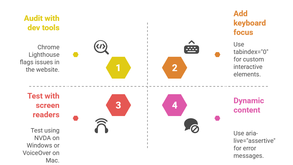 ARIA (Accessible Rich Internet Applications) enhances HTML when native semantics fall short. Use sparingly—native elements first. Follow the ARIA spec: no decoration-only roles, always valid HTML.