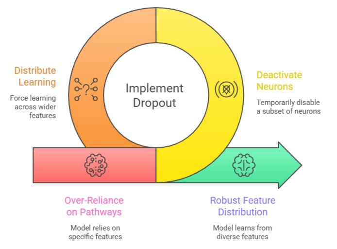 This prevents the model from relying excessively on specific pathways and forces it to distribute learning across a wider set of features.
