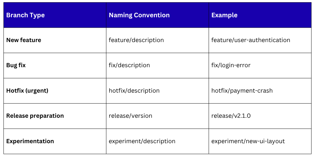 Good branch names make a repository easy to navigate. Here are widely used naming conventions: