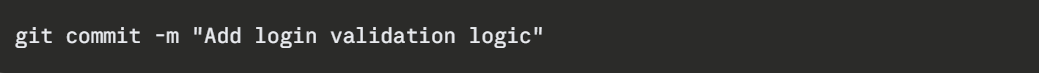 The -m flag allows you to write your commit message directly in the command. The message should be clear, concise, and descriptive — explaining what was done and why.