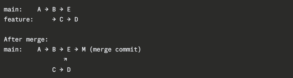 This happens when both the main branch and the feature branch have new commits since the branch was created. Git creates a new merge commit that combines both lines of work.