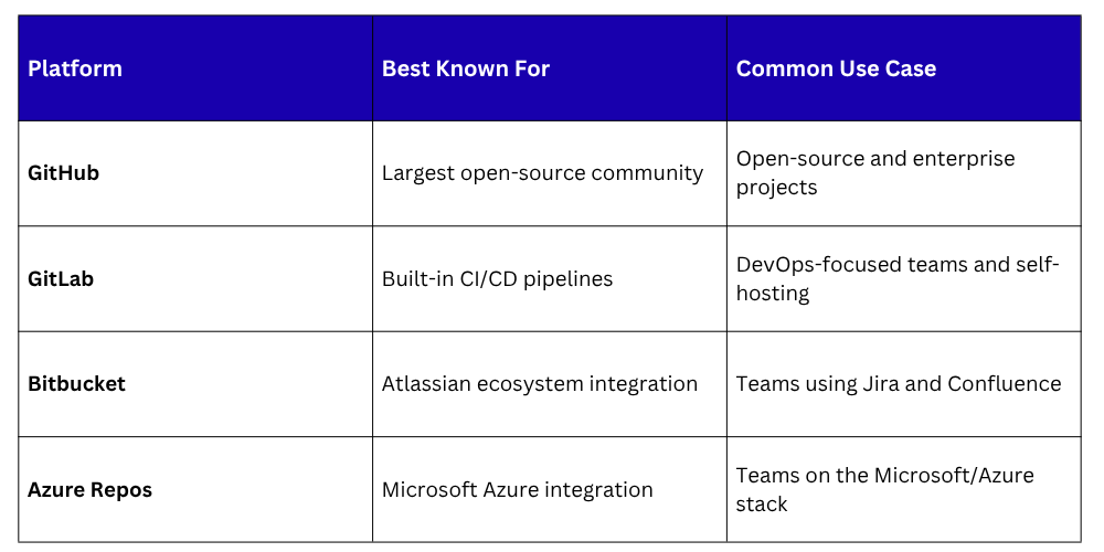 Several platforms are widely used to host remote Git repositories. Each offers similar core functionality with their own additional features: