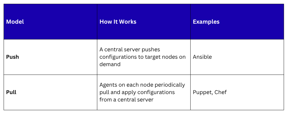 It communicates with target systems over SSH, making it easy to adopt without significant infrastructure changes. Ansible will be covered in detail in the next section.