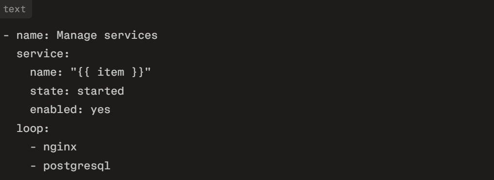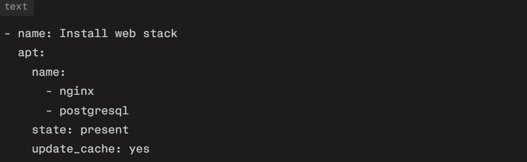 Keep software consistent across hosts. Use apt/yum modules for declarative installs.