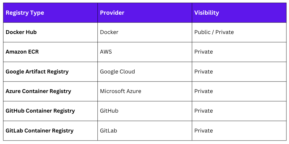 Docker Hub is the default public registry, a massive library of official and community images for databases, web servers, programming language runtimes, and more. Organizations also use private registries to store proprietary images securely.