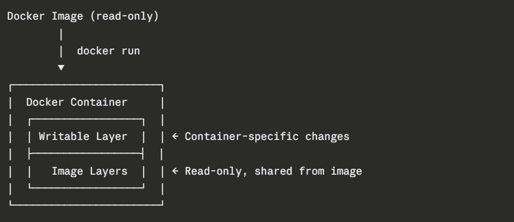 When a container runs, Docker adds a thin writable layer on top of the read-only image layers. Any changes made inside the container — files created, configurations modified, are written to this layer.