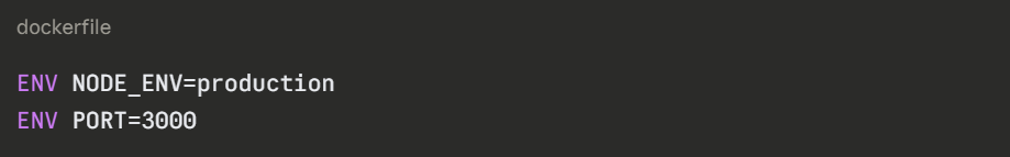ENV NODE_ENV=production and ENV PORT=3000 define environment variables used by the application during runtime.