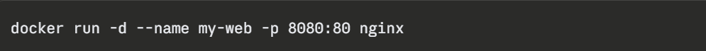 Port mapping follows the format -p host_port:container_port. In this example, visiting localhost:8080 on the host reaches port 80 inside the container.