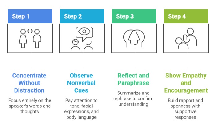 Active listening goes beyond simply hearing words; it involves fully focusing on the speaker, understanding the underlying message, and responding appropriately. Key elements include: