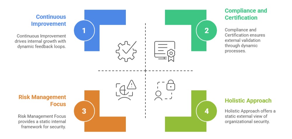 3. Continuous Improvement: An ISMS is not a one-time project but an ongoing management process. Organizations monitor system effectiveness, conduct internal audits, respond to incidents, and refine their controls regularly to adapt to evolving threats.