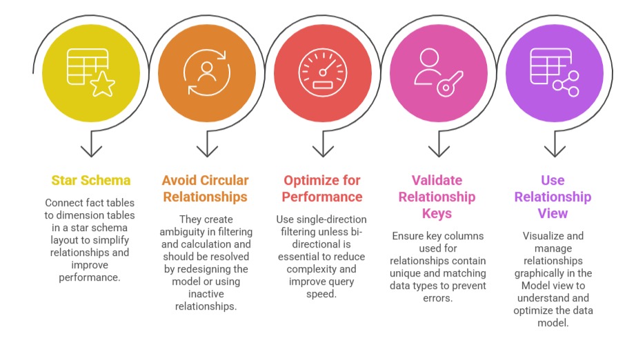 Defining the correct cardinality and relationship direction is crucial for the desired data filtering behavior and performance.