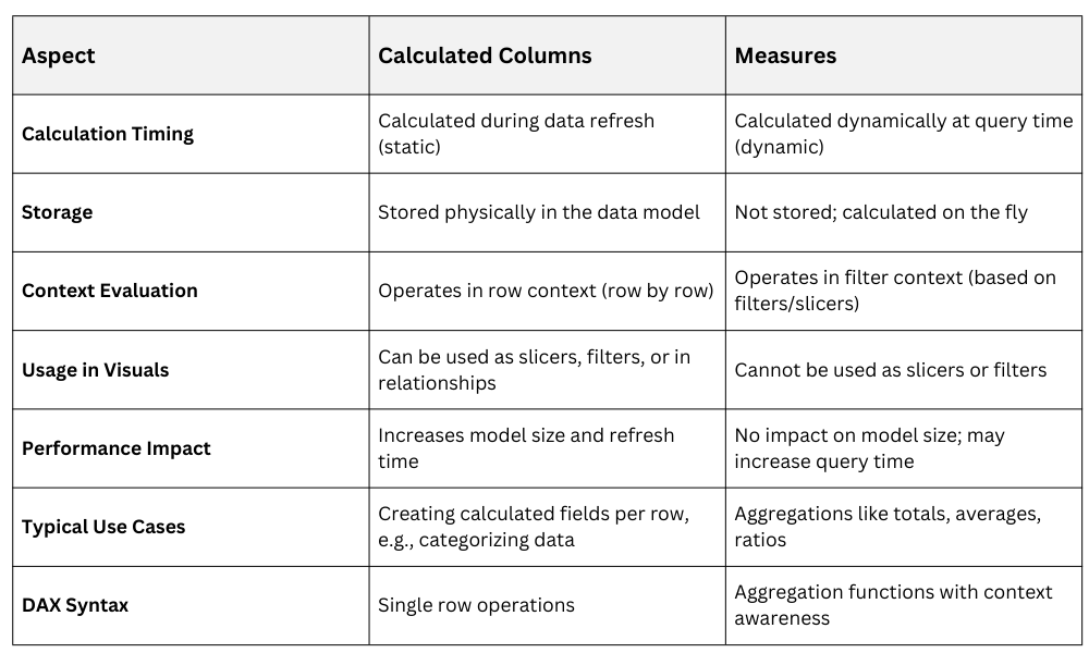 Both use Data Analysis Expressions (DAX) as their formula language, but understanding their distinctions is critical for designing efficient, accurate, and scalable BI reports.