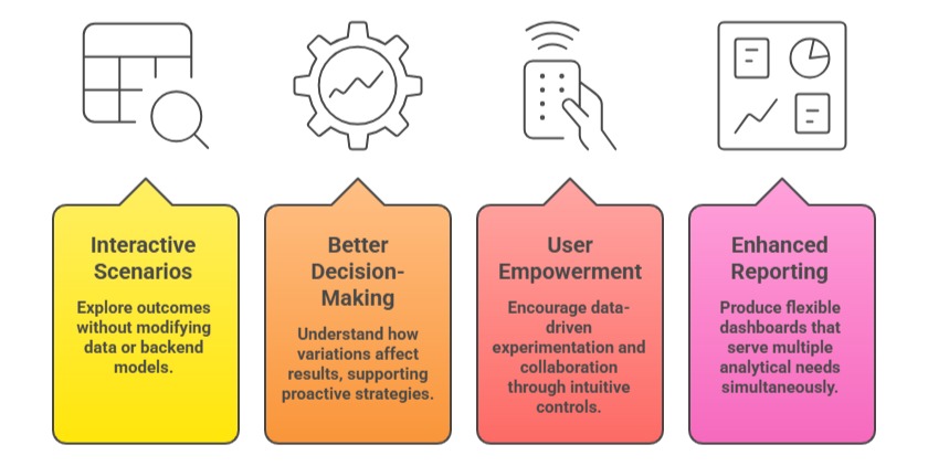 This integration of interactivity and real-time computation supports scenario modeling, budgeting, sensitivity analysis, and risk assessment directly within Power BI dashboards.