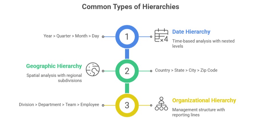 Hierarchies and drill-down features enhance how users interact with and interpret data. Listed below are the key benefits that support intuitive and insightful analysis.