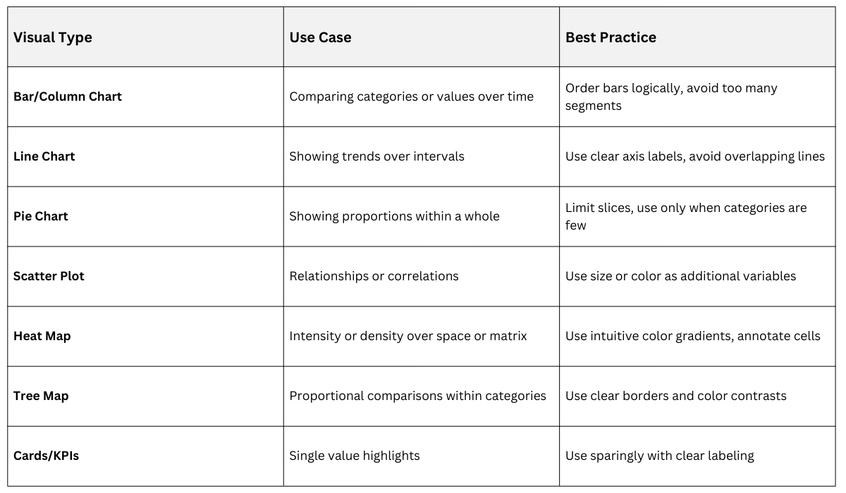 Well-designed visualizations enable faster understanding and better decisions. The list below outlines the key principles that ensure visuals are clear, meaningful, and actionable.