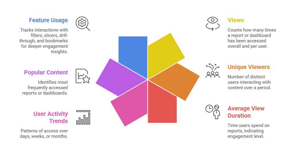 Analyzing usage metrics is critical for improving report design and user adoption. The following metrics explain how users interact with Power BI content over time.