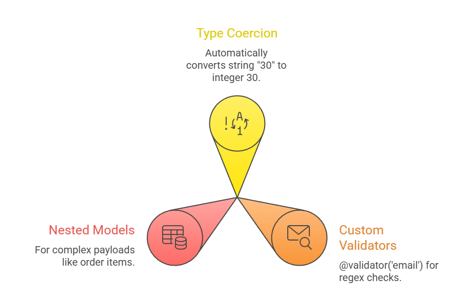 Modeling Responses with Pydantic: FastAPI supports response models for type-safe outputs.
