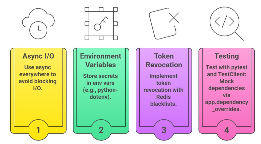 raise HTTPException(status_code=401, detail="Invalid token")This example verifies JWTs asynchronously, raising 401 errors for invalid tokens—aligned with RFC 7519 (JWT standard).