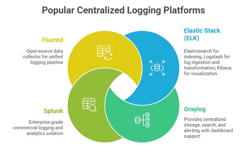 Centralized logging solutions improve visibility, incident detection, and system monitoring. The key technologies and architectural elements supporting centralized logging are described below.
