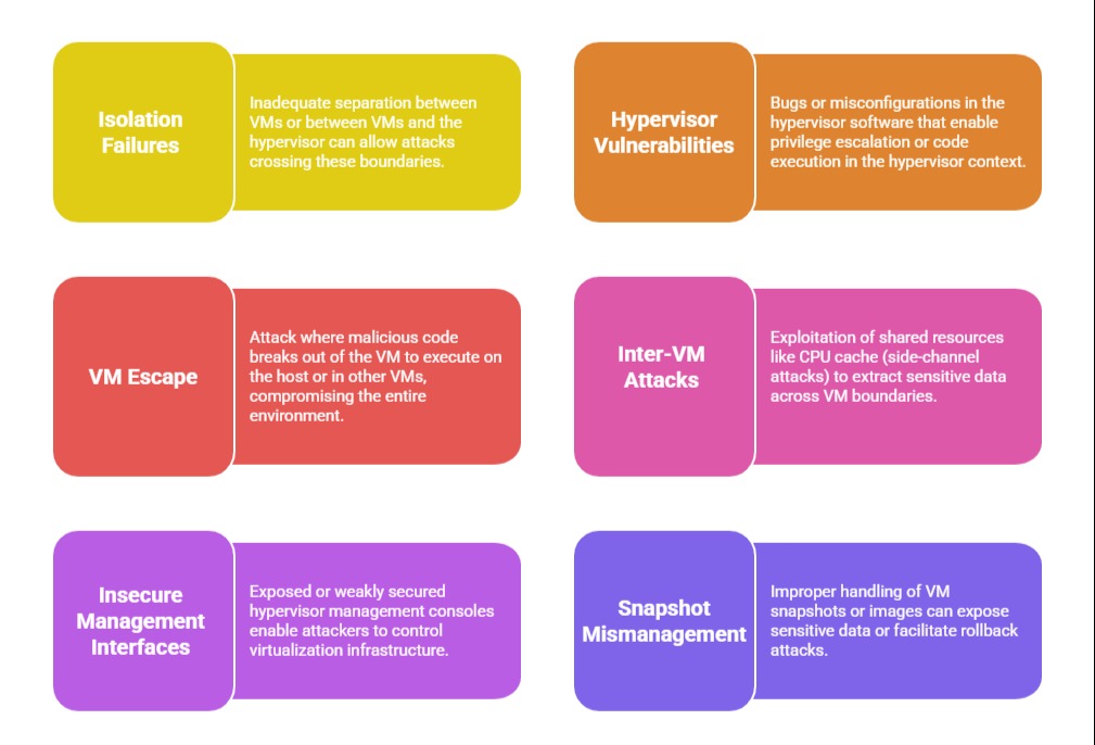 3. Side-Channel Attacks: Exploiting shared CPU caches or other hardware resources to infer data processed by other VMs.