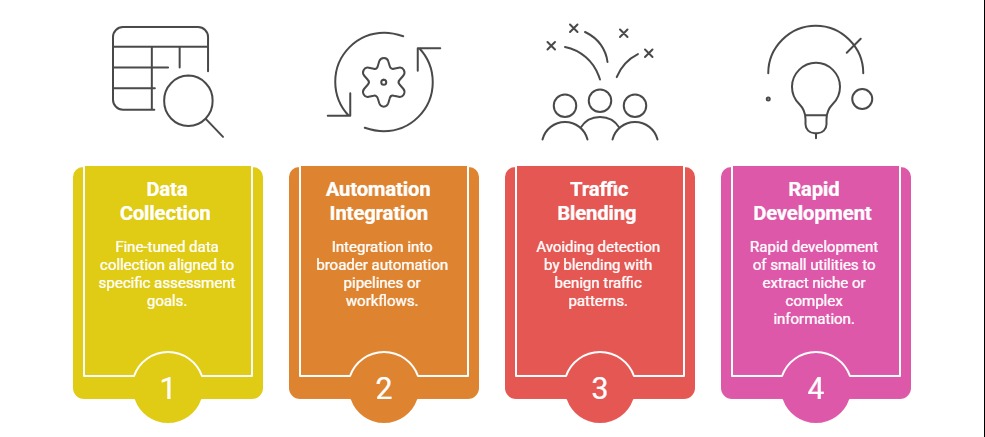 Pre-built tools can be limited by generic scope, detection by security mechanisms, or lack of specific tailored outputs. Custom scripts allow: