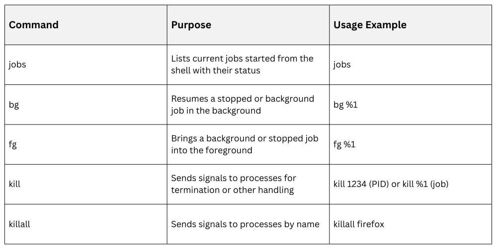 To manage tasks efficiently, it is important to understand process creation and execution modes. The list below introduces how commands interact with the shell during execution.