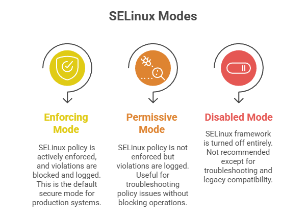 SELinux provides mandatory access control by enforcing security policies on Linux systems. The following modes determine how these policies are applied and how violations are handled.